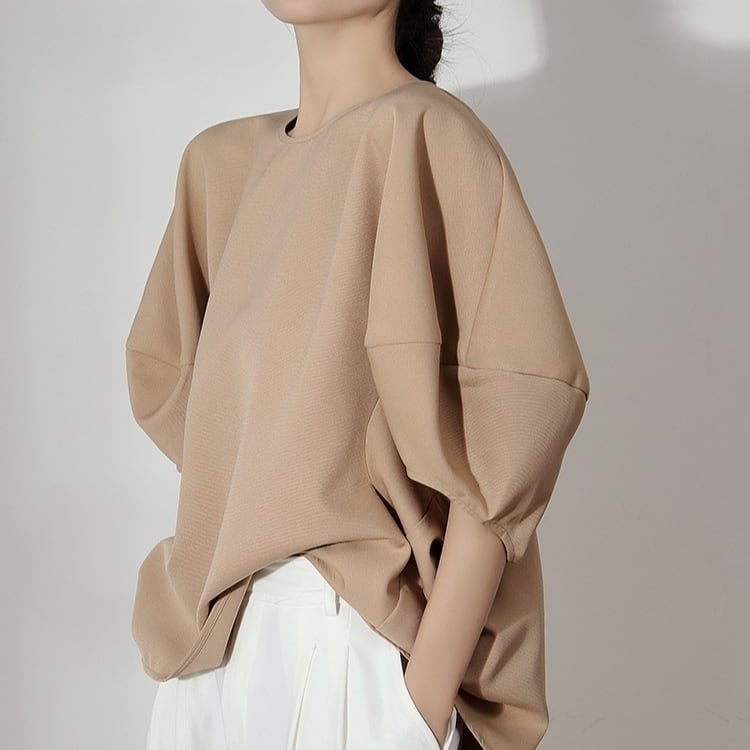 ラウンドネックと5分丈のランタンスリーブが女性らしさをぐっとUP。