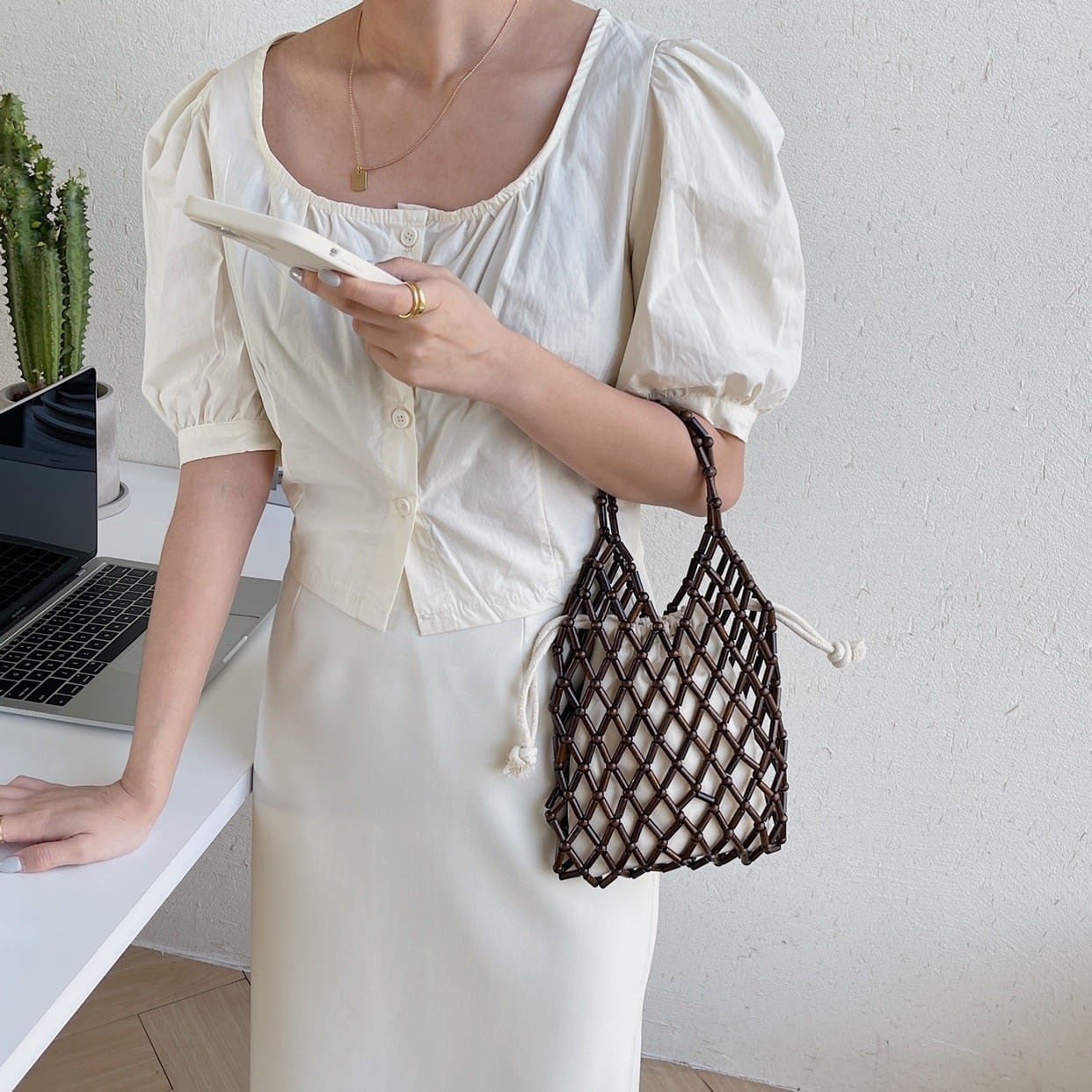 ナチュラルで可愛らしいデザインのウッドビーズバッグ。